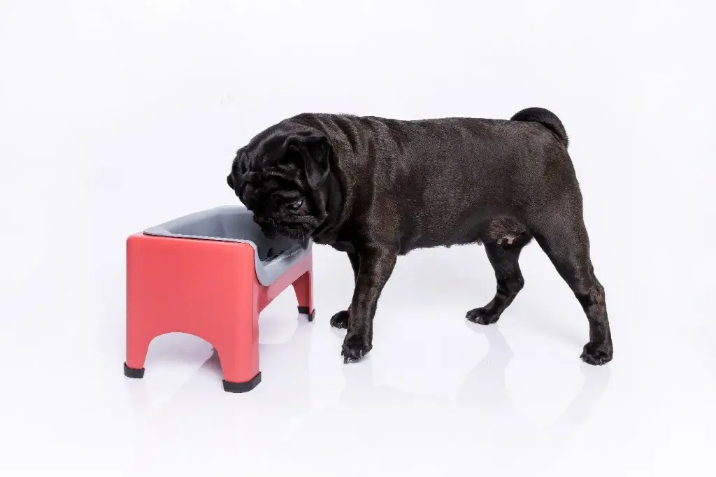Ele é elevado, anatômico e com design que desacelera a refeição, ajudando o Pug a comer devagar e com mais conforto.